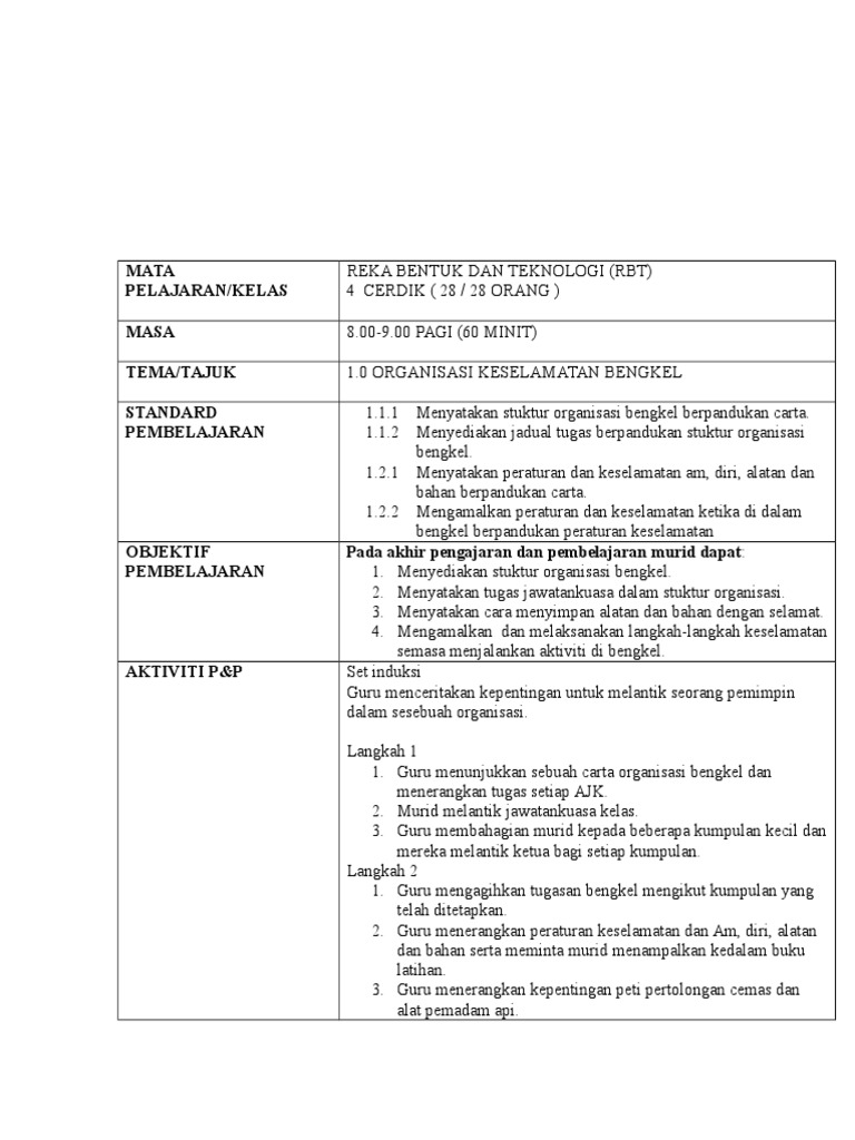 Rph Rbt Tahun 4 Asas Teknologi Peraturan Keselamatan Bengkel