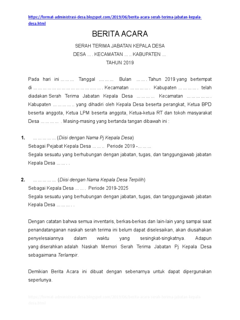 Berita Acara Serah Terima Jabatan Pj Kades Kpd Kades Terpilih Terbaru Doc