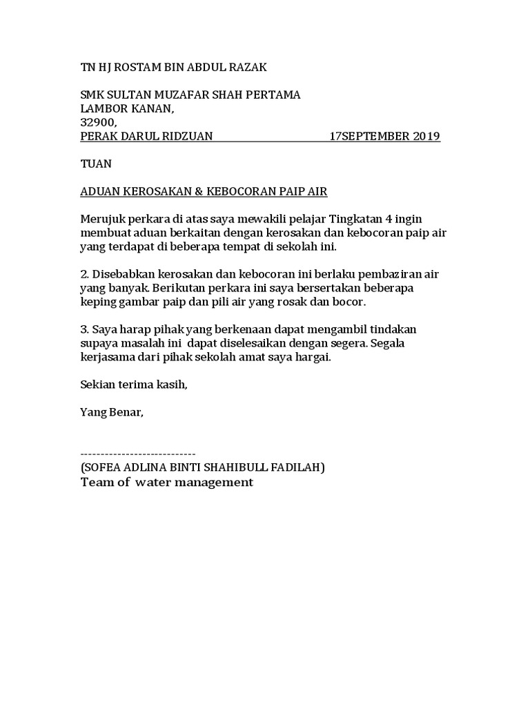 Contoh Surat Aduan Kerosakan Paip Air