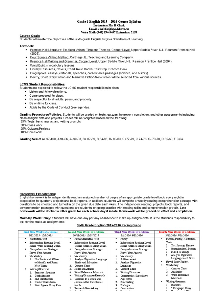 Syllabus Grade 6 English 2015 Reading Comprehension Homework
