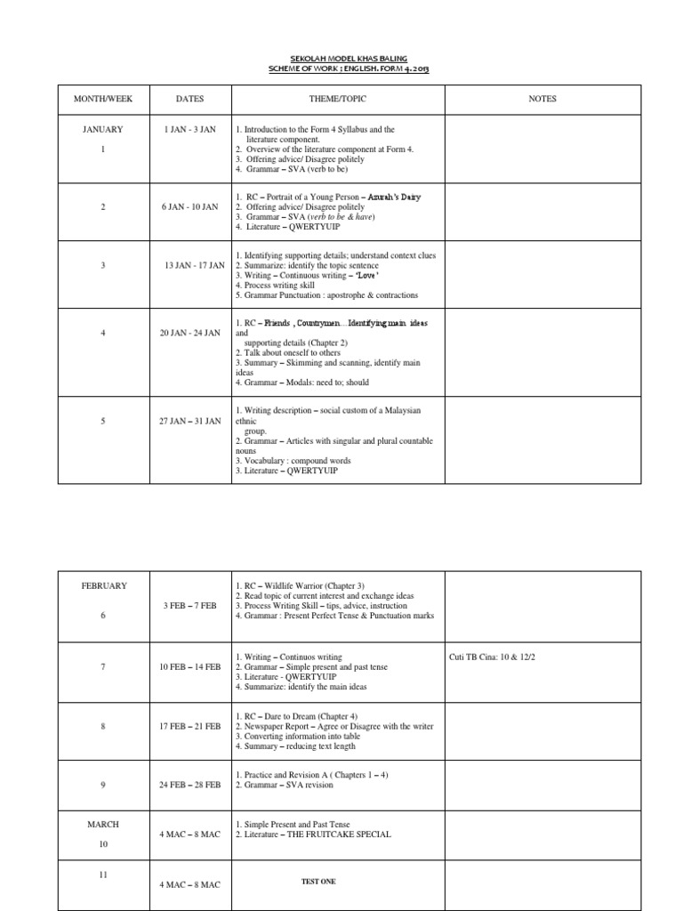 Form 4 English Language Scheme Of Work 2014