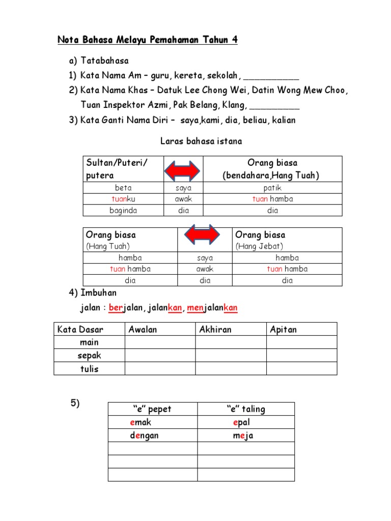 Nota Bahasa Melayu Pemahaman Tahun 4 Beta Saya Patik Ku Awak Hamba Baginda Dia Dia