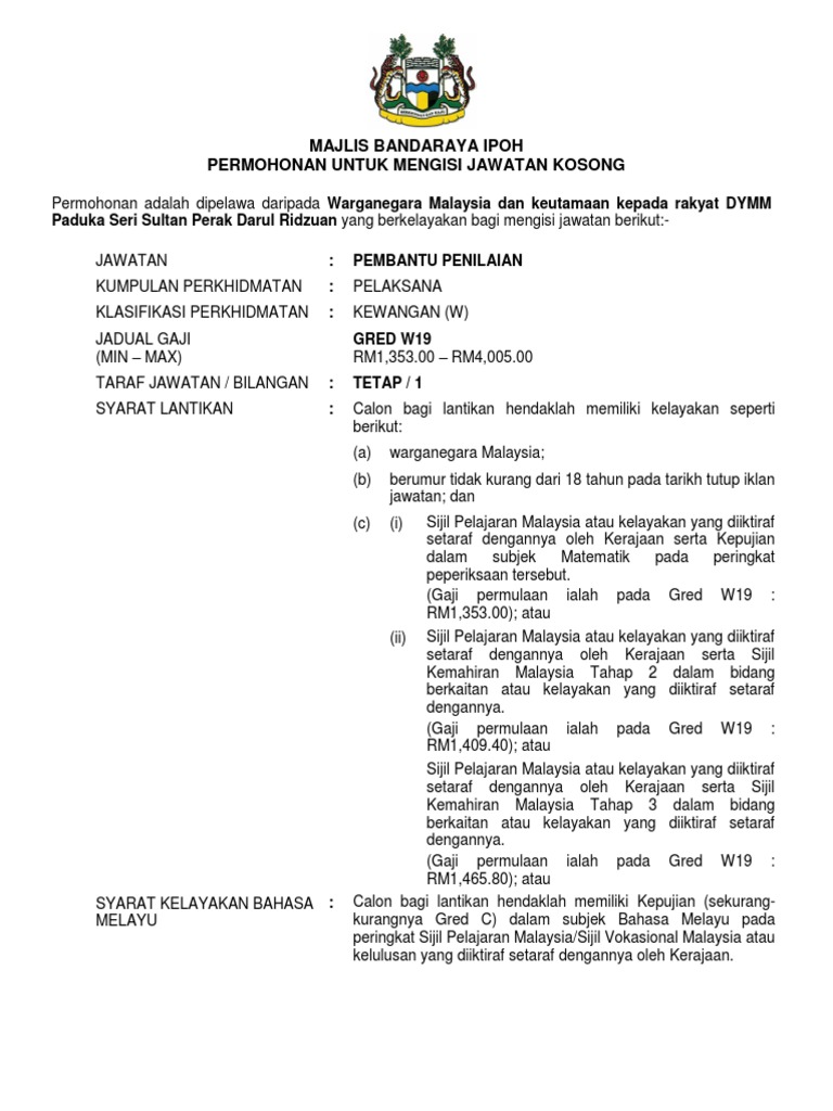 Jawatan Kosong Pembantu Penilaian Gred W19 Carian Semasa