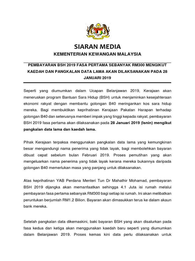 Siaran Media Kementerian Kewangan Malaysia Pendaftaran Bantuan Sara Hidup Bsh 2019