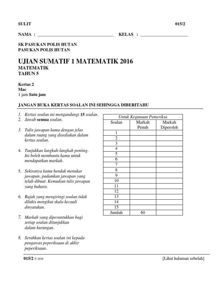 Ujian Sumatif 1 Matematik Tahun 5 2016