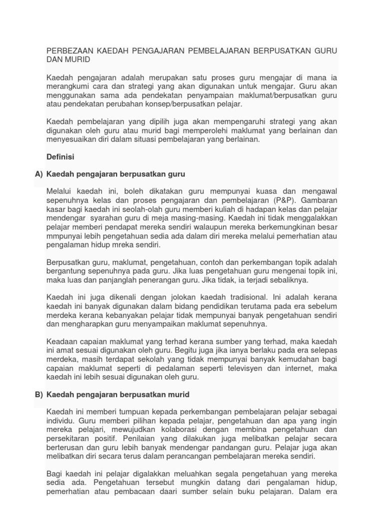 Perbezaan Kaedah Pengajaran Pembelajaran Berpusatkan Guru Dan Murid