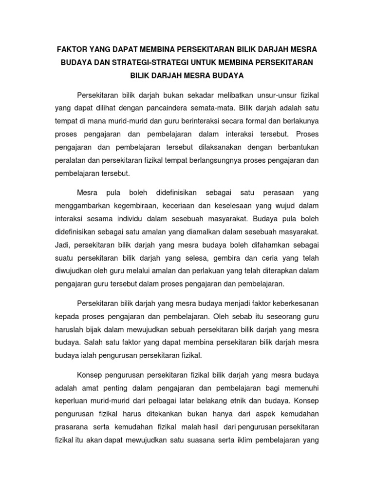 Faktor Yang Dapat Membina Persekitaran Bilik Darjah Mesra Budaya Dan Strategi