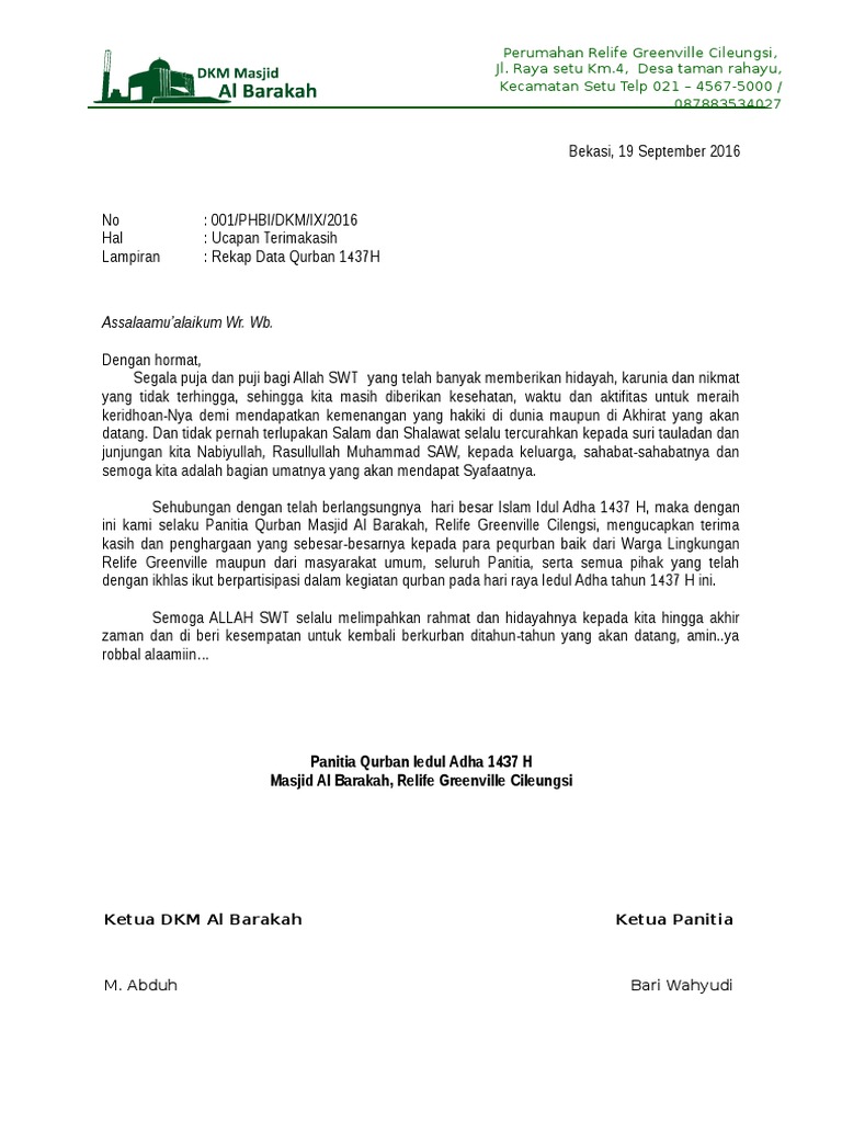 Surat Ucapan Terima Kasih Panitia Qurban