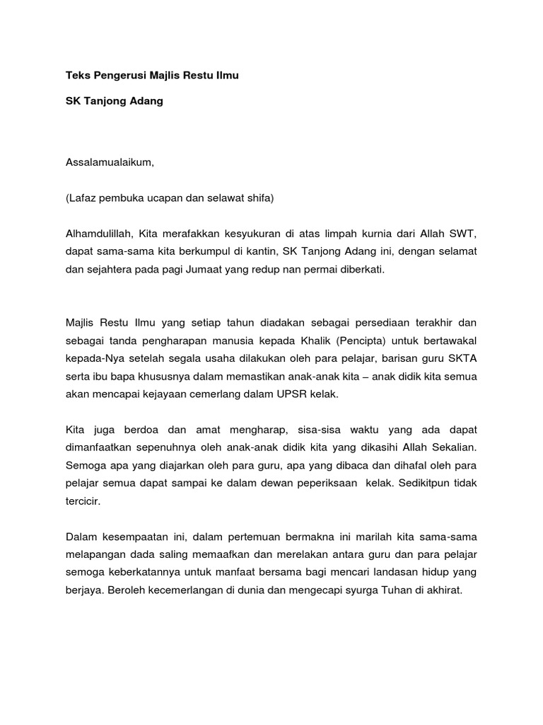 Teks Ucapan Wakil Murid Majlis Restu Ilmu